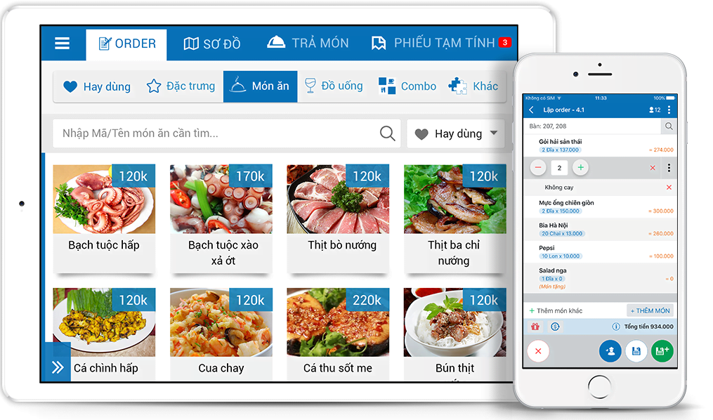 Tính năng order trên máy tính bảng giúp nhân viên thao tác nhanh, phù hợp với mô hình nhà hàng, cafe, trà sữa và các dịch vụ trả sau.